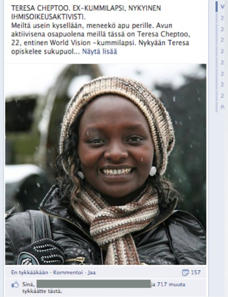 Meiltä usein kysellään, meneekö apu perille. Avun aktiivisena osapuolena meillä on tässä Teresa Cheptoo, 22, entinen World Vision -kummilapsi. Nykyään Teresa opiskelee sukupuolitutkimusta kenialaisessa yliopistossa. Vuonna 2007 16-vuotias Teresa puhui tyttöjen oikeuksista YK:ssa ja sai työstänsä kansainvälisen ihmisoikeuspalkinnon, 15 000 euroa. Hän lahjoitti koko summan tyttöjen aseman tukemiseen kotiseudullaan. Kannustatko Teresaa? Tykkää ja jaa tarina.